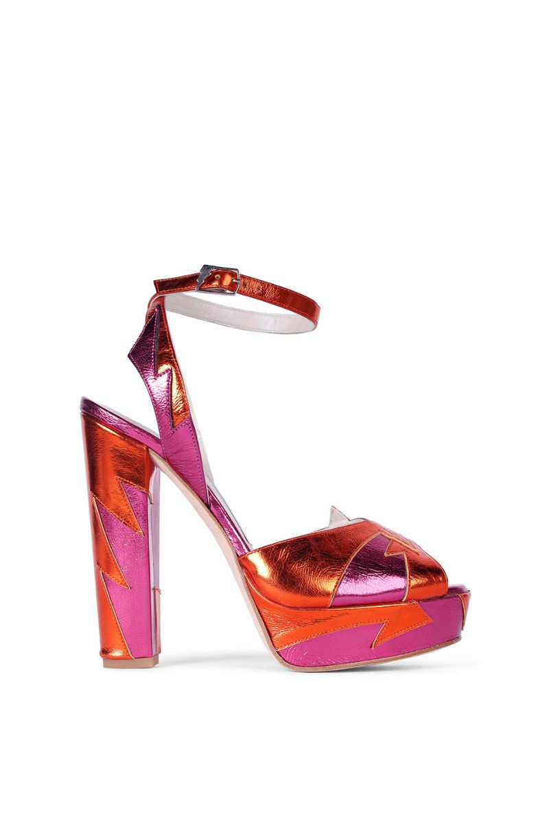 Crafted in metallic hot pink and orange leather, this single platform block heel brings all the energy of summer with our signature lightning bolt detailing, a bold peep toe, and a wrap- around ankle strap for that iconic TDH silhouette.
